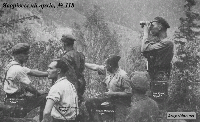 Другий зліва— Білінчук Дмитро, "Хмара" (див. фото № 39), показує рукою в центрі Мельник Петро, "Хмара" (див. фото № 41), крайній справа (дивиться в далекогляд) — Кулик Іван, "Сірий" (див. фото № 84), інші — невідомі. Відбиток з негатива виготовлений повстанським фотографом, опублікований в книжці М. Білінчука "Доля борця" (с. 24).