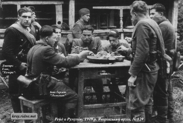Обід в румунської родини. Крайній зліва (дивиться в об"єктив)- Ілюк Дмитро(Митник), "Кичера"(?-1951). Місце народження: с.Криве Поле Верховинського р-ну. Кулеметник. Загинув у бою з оперзагоном МГБ в с. Пістині Косівського р-ну. Особу ідентифіковано Петром Підлетейчуком і Василем Портяком. Третій зліва- Гаргат Іван "Липкевич". Інші- невідомі. Фото зроблене під час рейду в Румуію в червні 1949р.
