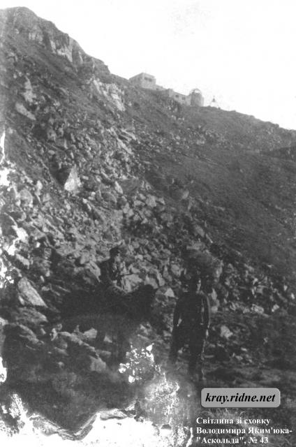 Сотенний Дмитро Білінчук-“Хмара” (справа) і два невідомих під будівлею обсерваторії на горі Піп Іван. Контактний відбиток з 6-см плівки. Папір глянцевий тонкий невідомого виробництва, 90х58 (78х50), пакет 3.